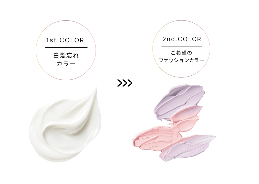 「白髪忘れ」の施術工程はいたってシンプル。ファーストカラーとして「白髪忘れ」を塗布し、セカンドカラーとしてファッションカラーを重ねるだけ。地肌と白髪の明度差を整えるため、白髪のある髪にもファッションカラーが均一に入りやすくなります。